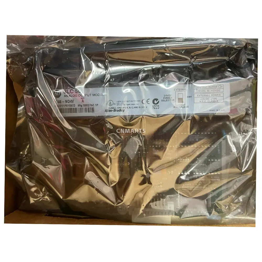 Purchase the Allen-Bradley 1746-NO4V, a 4-channel analog voltage output module for the SLC 500 series. Features a -10V to +10V range, selectable power, and is rated for Class I, Div 2 hazardous locations.