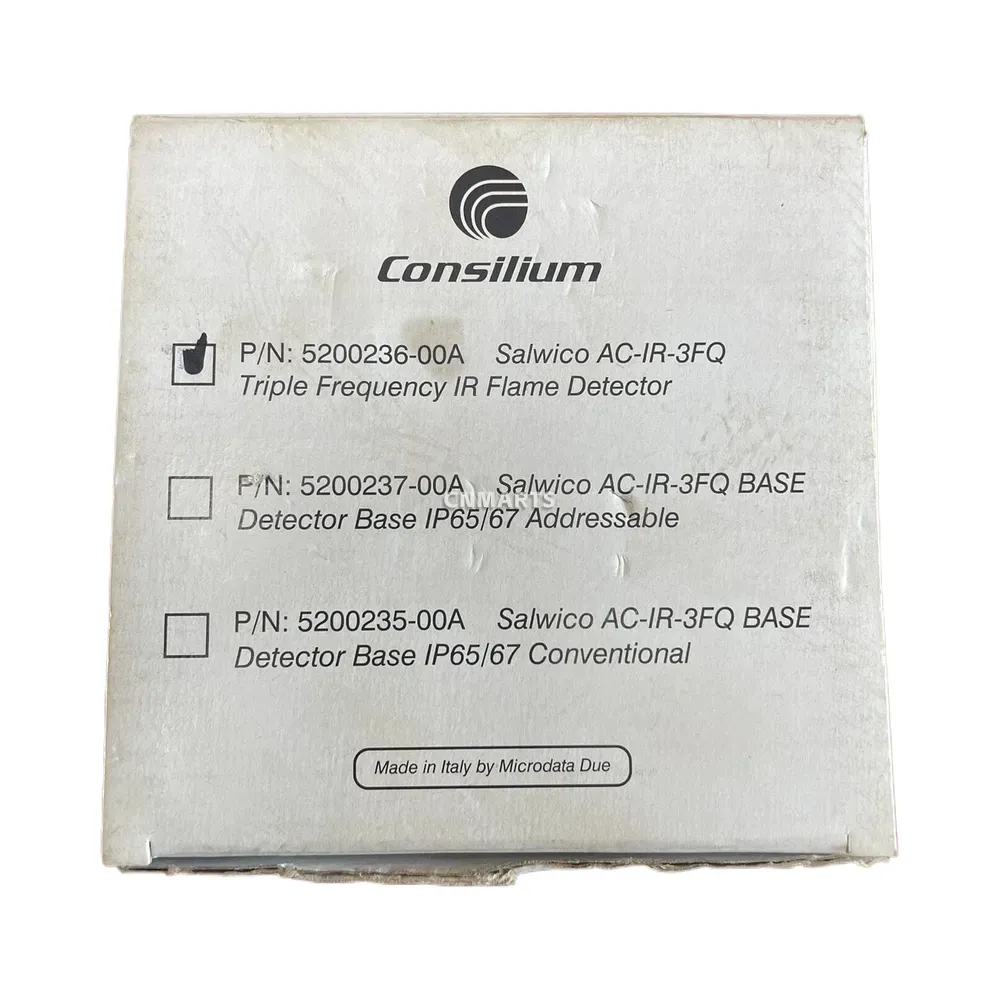 The Consilium 5200236-00A, also known as the Salwico AC-IR-3FQ, is an advanced Triple Frequency Infrared (IR) flame detector engineered for high-risk environments where rapid and reliable fire detection is critical. By utilizing three separate IR sensors, it effectively analyzes the radiation emitted by flames, ensuring high sensitivity to actual fires while providing excellent immunity to false alarms from sources such as sunlight, welding, or other hot surfaces. Its robust housing with an IP66 and IP67 protection class makes it suitable for harsh industrial and marine applications. This detector complies with the EN54-10 standard, making it a trusted component for modern fire alarm systems.
