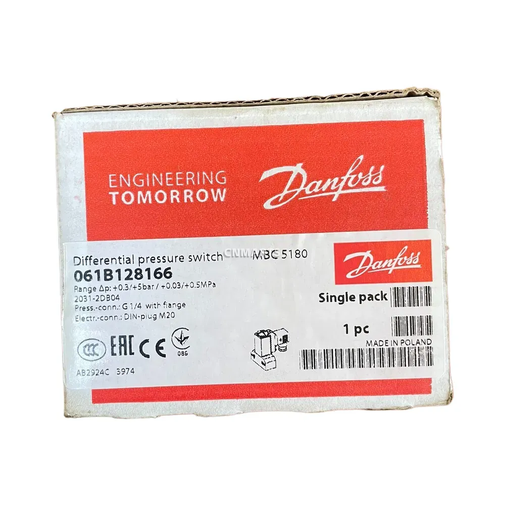 Shop the Danfoss MBC 5180 Differential Pressure Switch (061B128166), a compact and durable block-type switch with a 0.3 to 5 bar range. Features IP65 protection, G 1/4 flange connection, and is ideal for marine and industrial use.