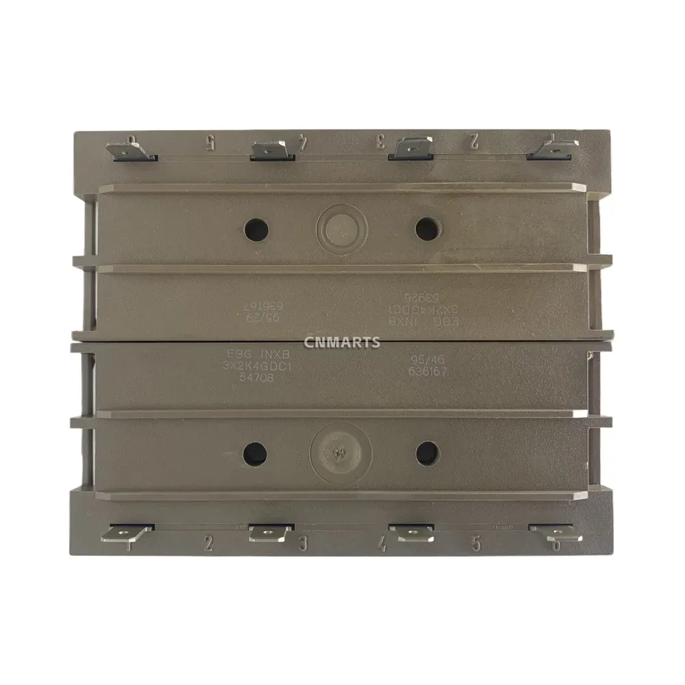 The EBG 3X2K4GDC1 is a high-power industrial braking resistor module designed for demanding applications such as dynamic braking in variable frequency drives (VFDs), inverters, and other power conversion systems. Engineered for superior thermal performance, it features a robust aluminum housing with integrated cooling fins to efficiently dissipate large amounts of energy as heat, protecting drive systems from overvoltage during motor deceleration. The module contains three independent 2.4 kΩ resistor elements, accessible via six numbered terminals, offering flexible wiring configurations to meet specific application requirements. Its durable construction ensures reliable operation in harsh industrial environments.