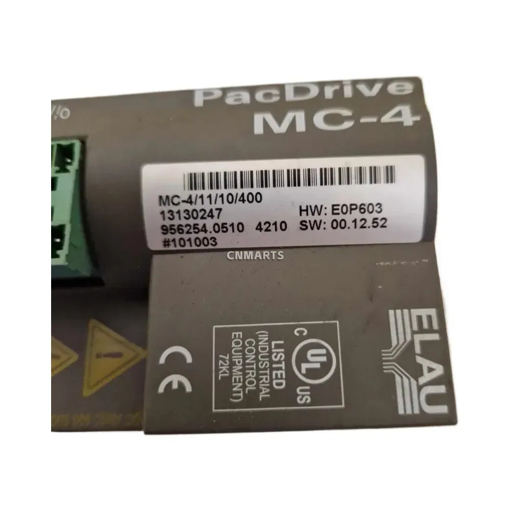 The ELAU MC-4/11/10/400 is a high-performance servo drive module from the renowned PacDrive series, designed for demanding industrial automation and motion control applications. As an integral component of the PacDrive system, this single-axis servo drive provides precise and dynamic control for servo motors. It features a compact design with integrated power and control electronics, simplifying cabinet installation and wiring. Equipped with multiple terminal blocks for power input, DC bus, motor output, and I/O, along with diagnostic LEDs and communication interfaces, the MC-4/11/10/400 offers robust connectivity and easy serviceability. This UL Listed drive is a reliable solution for complex machinery requiring synchronized motion control.