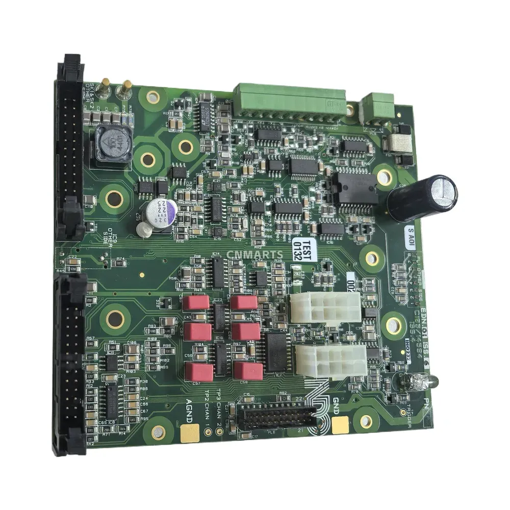 The NDC C105/14594 is a genuine printed circuit board (PCB) assembly engineered for use in industrial measurement and control systems. This robust board is designed as a direct replacement or spare part, ensuring the continued reliability and precision of your NDC equipment. It features a durable green solder mask and a combination of surface-mount and through-hole technologies for optimal performance. The assembly is equipped with versatile connectivity options, including green screw terminal blocks for secure wiring, pin headers, and backplane connectors for system integration. Onboard diagnostics are facilitated by a status LED and clearly marked test points (TP2 for CHAN 1, TP3 for CHAN 2), simplifying troubleshooting and maintenance procedures in the field.