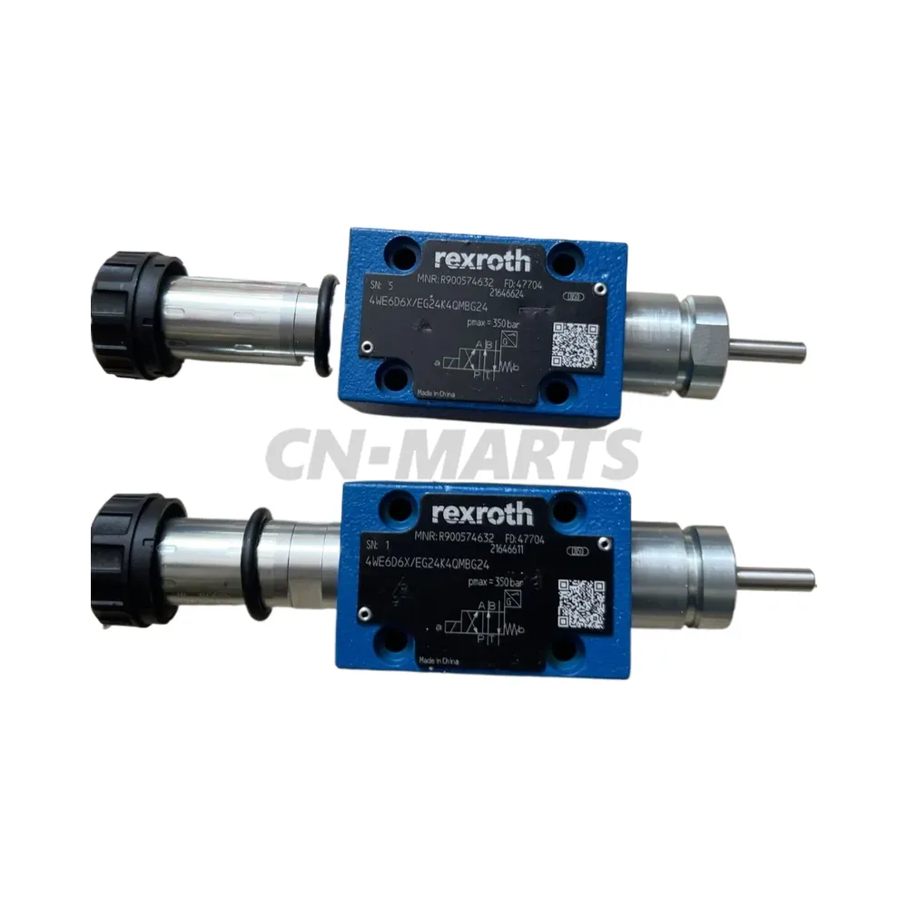 Buy the genuine Rexroth 4WE6D6X/EG24K4QMBG24 (R900574632) NG6 directional control valve. This 4/3-way solenoid-operated hydraulic valve features a 24V DC coil, a closed-center spool, and a max pressure rating of 350 bar.