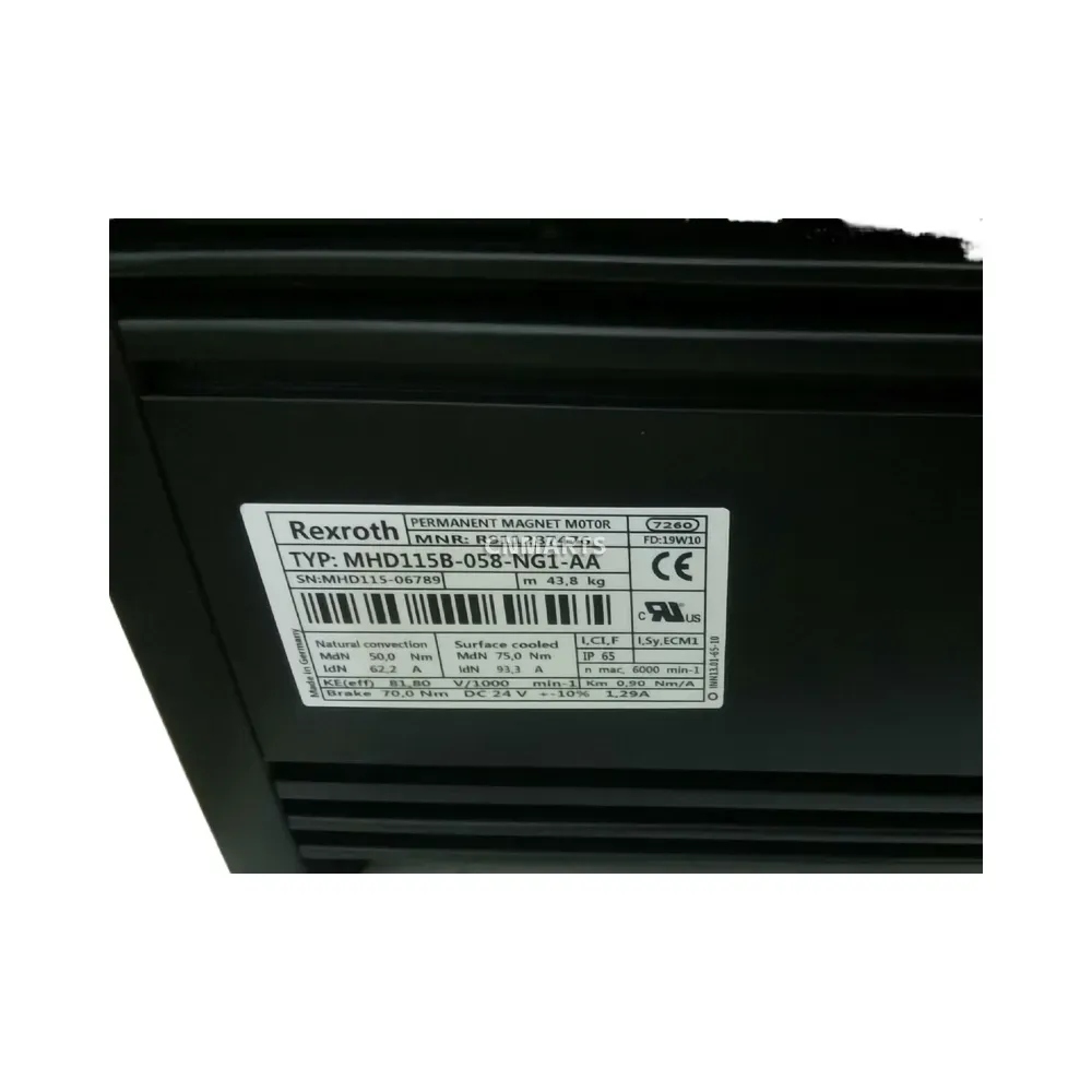 Shop the powerful and reliable Rexroth MHD115B-058-NG1-AA permanent magnet motor. This German-made servo motor delivers up to 75.0 Nm of torque and a maximum speed of 6000 RPM. Featuring an integrated 70 Nm holding brake and IP65 protection, it’s the perfect solution for high-performance machine tools and industrial automation systems.