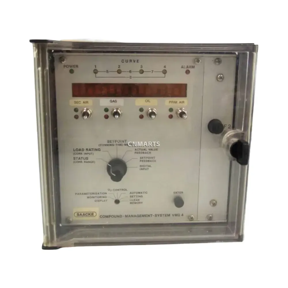 The SAACKE VMS 4 is a sophisticated electronic compound management system designed for the precise control and optimization of industrial burners. It expertly manages the fuel-air ratio for gas, oil, or dual-fuel combustion systems, ensuring maximum efficiency, operational safety, and minimal emissions. The intuitive front panel features a clear digital display and dedicated controls for secondary air, primary air, gas, and oil, allowing for easy monitoring and adjustment. With its comprehensive parameterization, monitoring, and diagnostic capabilities, including O2 control integration, the VMS 4 provides reliable and automated control for a wide range of combustion applications, making it an essential component for modern boiler and furnace management.