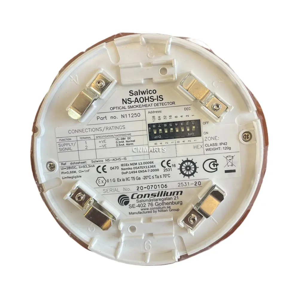 Buy the Consilium NS-AOHS-IS (N11250), an intrinsically safe optical smoke and heat detector for Salwico fire alarm systems. ATEX and IECEx certified for reliable fire detection in hazardous areas.