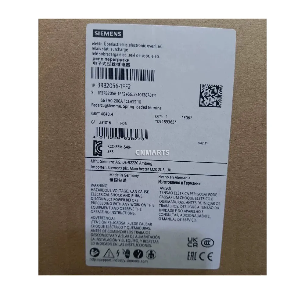 Protect your motor with the SIEMENS 3RB2056-1FF2 SIRIUS electronic overload relay. Features a 50-200A adjustable range, CLASS 10 trip, and secure spring-loaded terminals for reliable industrial motor protection.