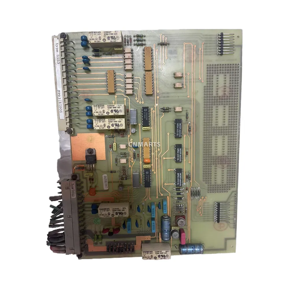 The Simac 3553 is a specialized industrial printed circuit board designed to function as a miscellaneous control and power supply unit. This robust PCB is engineered for reliability in demanding industrial environments. It is populated with high-quality components from leading manufacturers, including Siemens 12V relays, NEC D8253 and D8255 integrated circuits, and various Omron chips. The board serves as a critical component for managing power distribution and various I/O tasks within a larger system. Identified by part number D70.1.12006, this board is an essential replacement part for maintaining and repairing compatible industrial machinery.