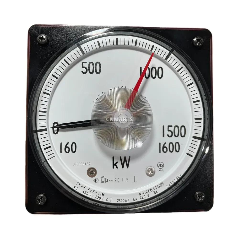 Purchase the TOYO KEIKI EVF-11M, a reliable JIS-certified analog wattmeter for 3-phase systems. This panel meter features a 0-1600 kW scale and is designed for use with VT and CT transformers, making it ideal for industrial power monitoring.