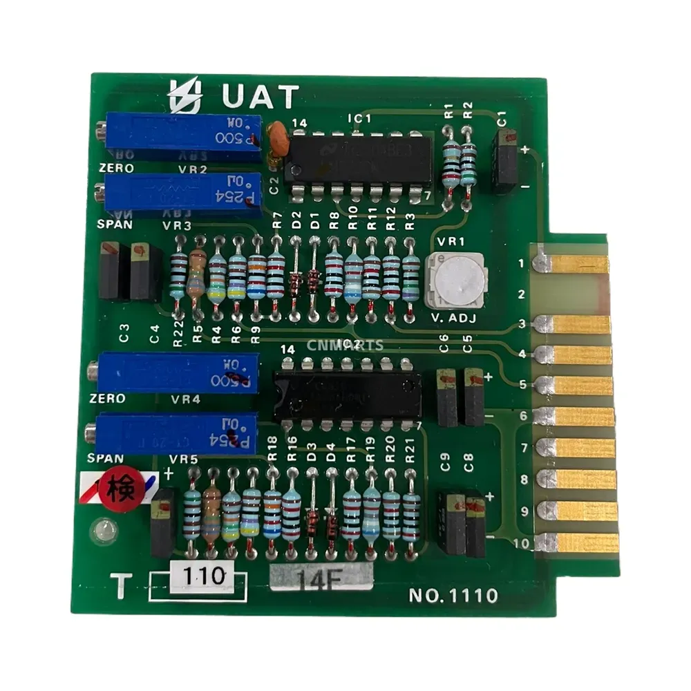 The UAT NO. 1110 is a dedicated signal conditioning printed circuit board (PCB) module designed for precise calibration and signal processing in industrial or instrumentation systems. This board is engineered to adjust and stabilize electronic signals, featuring a robust set of components for reliable performance. It includes two 14-pin dual in-line package (DIP) integrated circuits that form the core of its processing capabilities. For fine-tuning, the module is equipped with multiple blue potentiometers for independent ZERO (VR2, VR4) and SPAN (VR3, VR5) calibration, along with a white trimmer (VR1) for voltage adjustment. Connectivity is handled via a standard 10-pin edge connector, ensuring secure integration into a parent system. This module is an ideal replacement part for maintaining or repairing equipment that requires accurate signal conditioning.